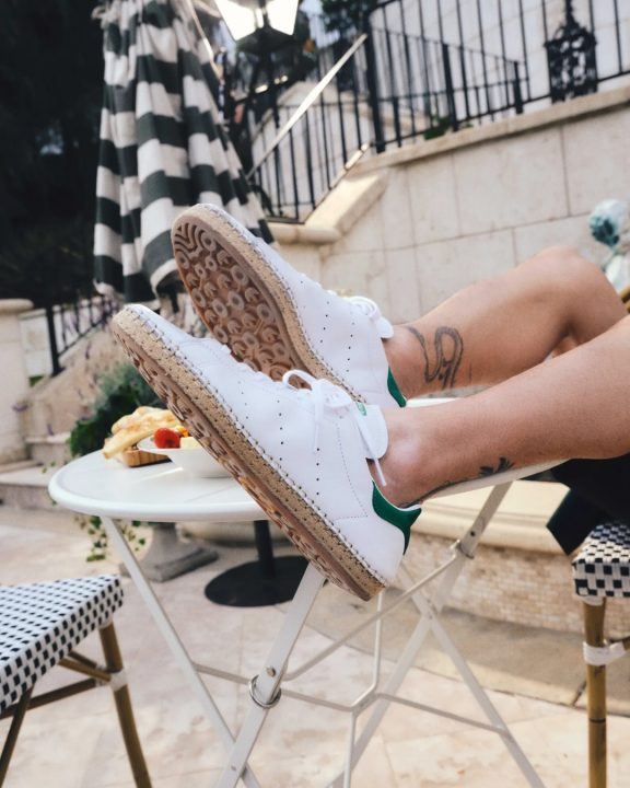 O grande destaque da collab é o Stan Smith Espadrille, um remix do tênis mais icônico da adidas. O modelo surge com solado de juta (espadrille vibes) e vem em duas versões: couro branco minimalista e tecido preto com textura, ambos com aquele detalhe desconstruído no calcanhar: um “bigode” em chenille que dá o toque fun e artesanal.