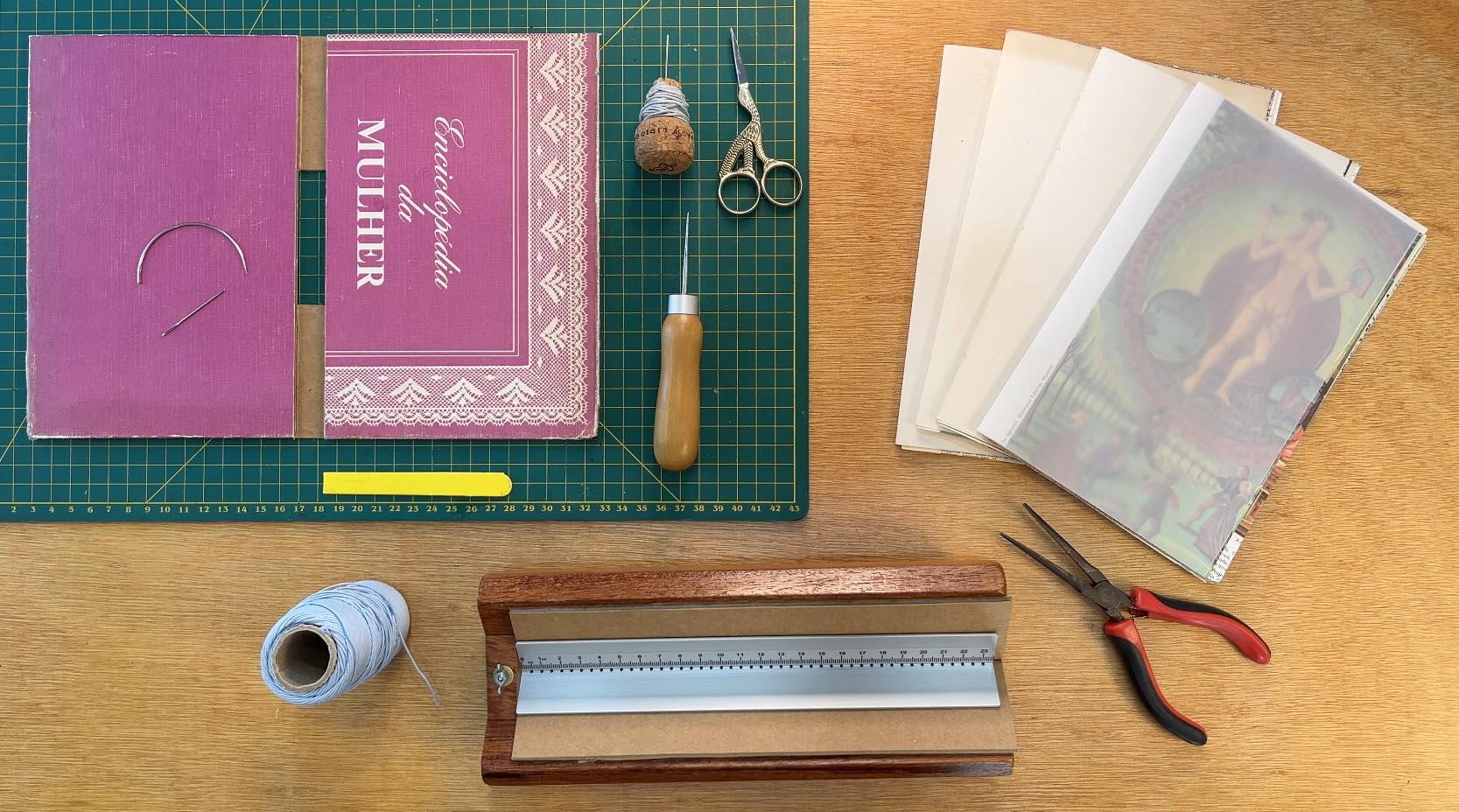 A proposta une técnicas de colagem e encadernação manual com a criação de cadernos que misturam texturas, papéis, lembranças e registros visuais. Os participantes irão aprender a técnica buttonhole stitch bookbinding, desenvolvendo peças autorais que traduzem suas memórias e referências pessoais.