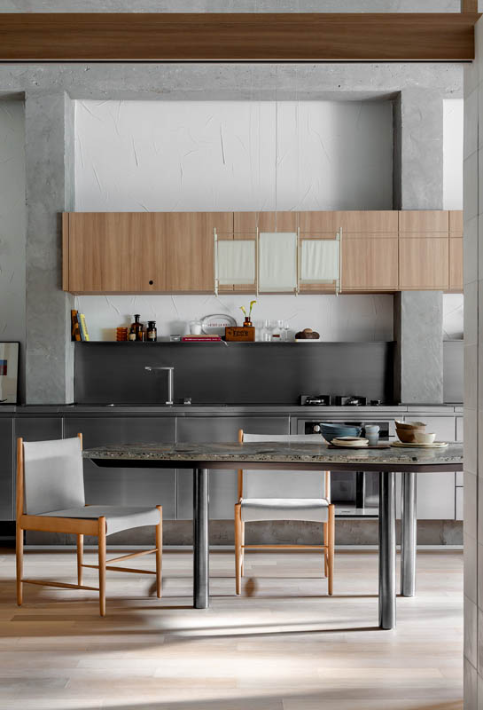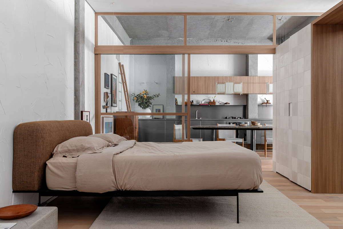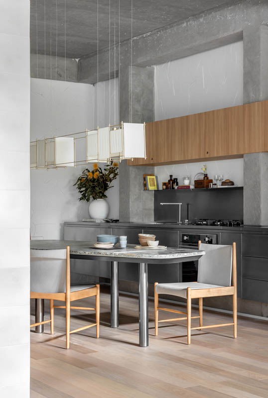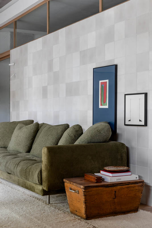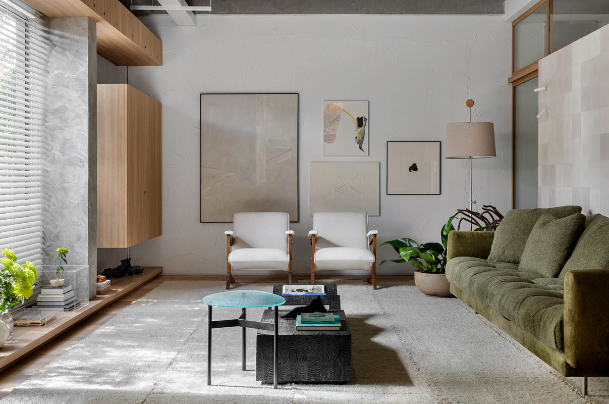 Os móveis, desenhados pelo Studio Gabriel Bordin, reforçam essa atmosfera afetiva. A mesa de centro tem vincos pensados para manter livros abertos nas páginas mais marcantes, e a estante com pequenas portinhas simboliza recordações guardadas com carinho. A simplicidade formal contrasta com o refinamento das obras de arte e peças de design assinadas por nomes como Walmor Correa, Tomie Ohtake, Ricardo Homem, Alfredo Volpi e Sérgio Rodrigues — este último homenageado com peças icônicas como a poltrona Carmel e as cadeiras Lucio e Cantu.