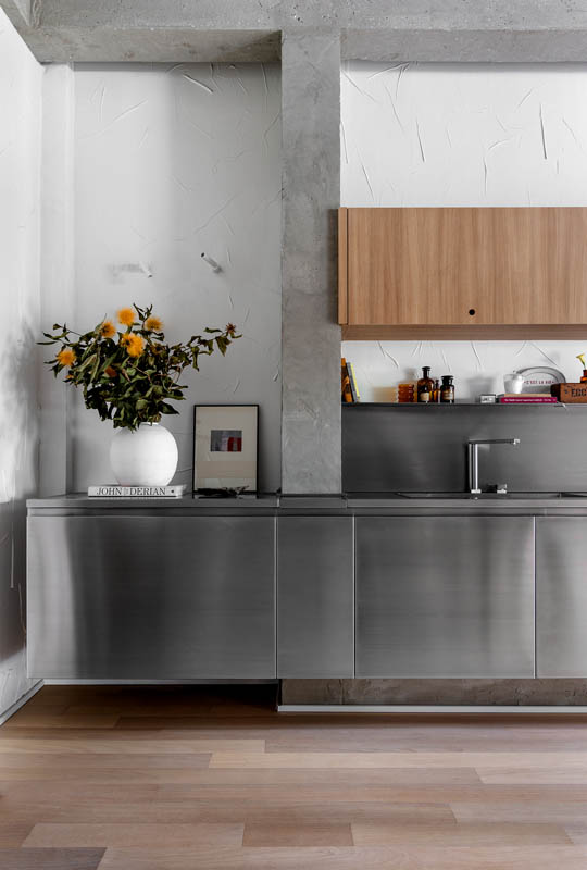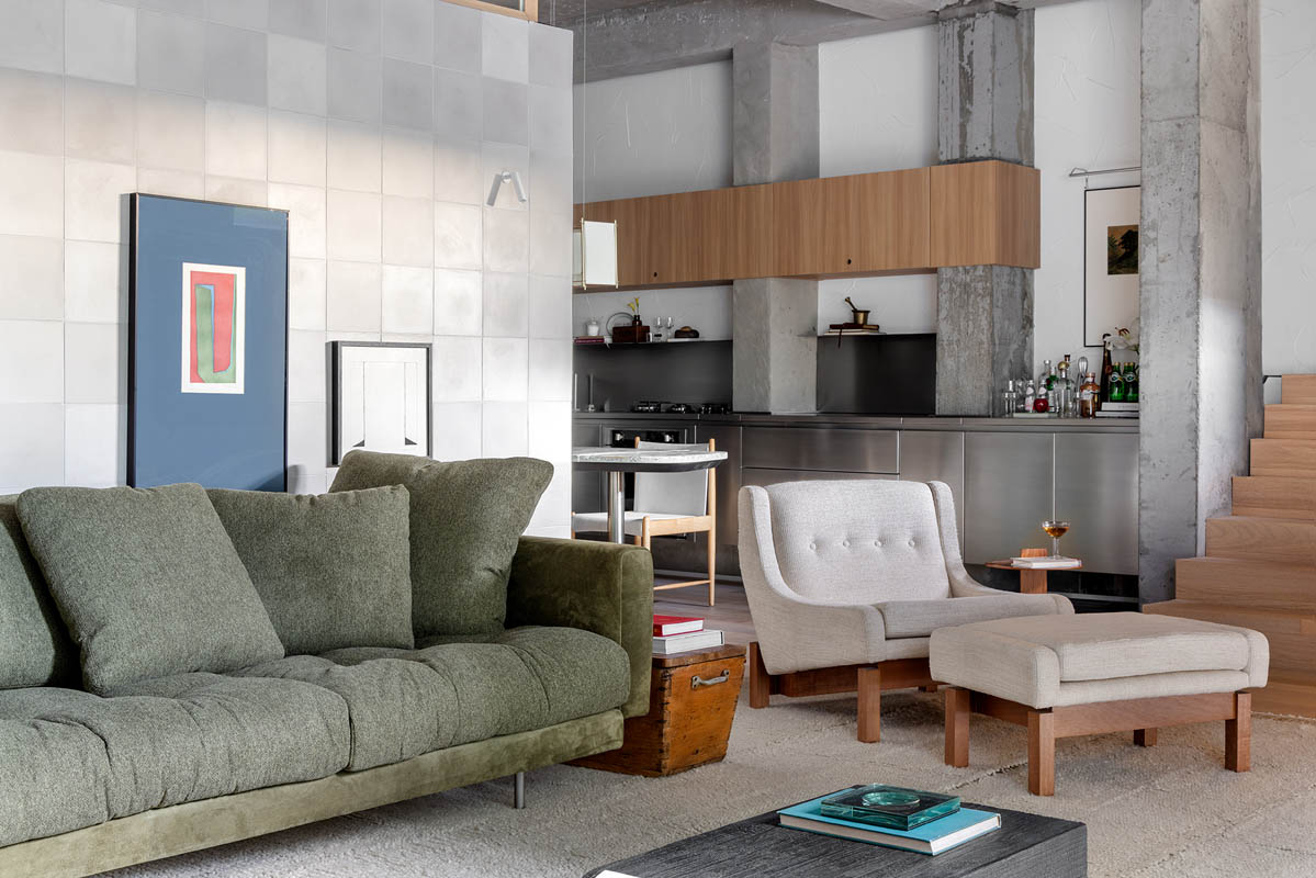 Com mais de 90 m², o projeto homenageia um personagem imaginário: o cronista, o escritor, o observador da vida. Suas paredes trazem um lambe-lambe feito com páginas de jornais sobrepostas por pintura off-white, num diálogo entre passado e presente. A paleta de cores — entre branco, ocre, verde, cinza e preto — traduz a sobriedade poética de quem vive entre histórias.