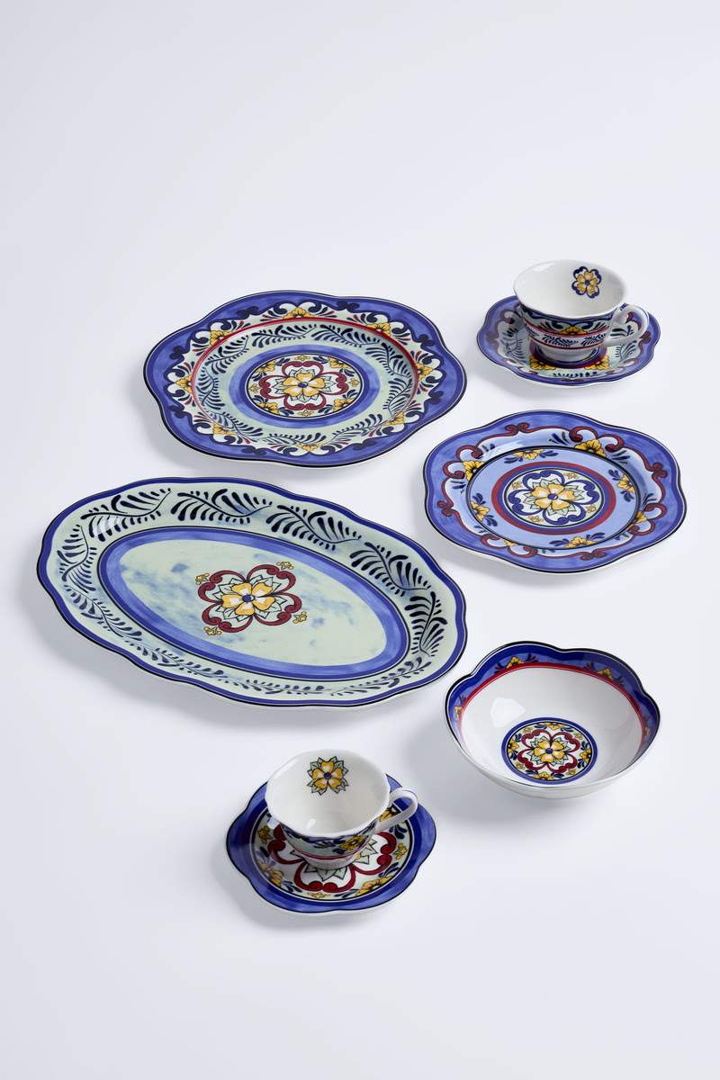 Composta por prato raso, prato de sobremesa, bowl, xícaras de chá e café e travessa oval, a coleção traz desenhos criados, com exclusividade, pelo time de criação da Le Lis Casa que reinterpretam os arabescos e florais característicos da Talavera, preservando o gesto livre e a pincelada viva que remetem à pintura manual. Em uma paleta que combina tons de azul, amarelo, verde e vermelho, as peças evocam a alegria solar e o frescor das casas coloniais mexicanas, ao mesmo tempo em que dialogam com as tradicionais fachadas azulejadas brasileiras.