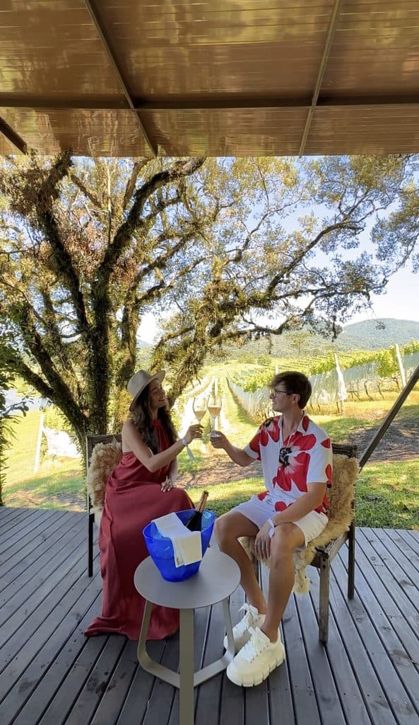 A experiência continua com uma degustação guiada por sommelier, que apresenta vinhos de altitude cuidadosamente harmonizados. Na parte da tarde, o encerramento acontece de forma memorável, com uma parrilla completa em meio aos vinhedos, acompanhada de boa música e do cenário natural da Serra Catarinense.